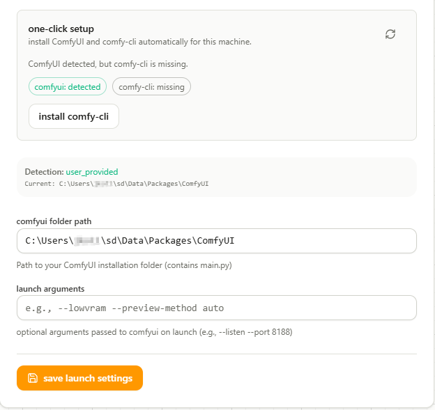 Use one-click install when comfy-cli is missing, or point Studio to your existing ComfyUI directory.