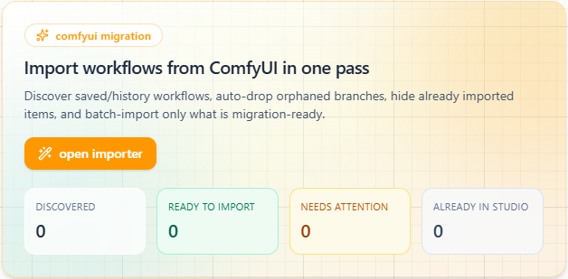 Batch-import migration-ready workflows so your working setups become reusable Studio tools.